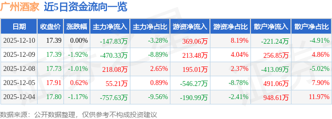 12月10日的资金流向数据方面,主力资金净流出147.83万元,占总成交额3.28%,游资资金净流入369.06万元,占总成交额8.19%,散户资金净流出221.24万元,占总成交额4.91%。