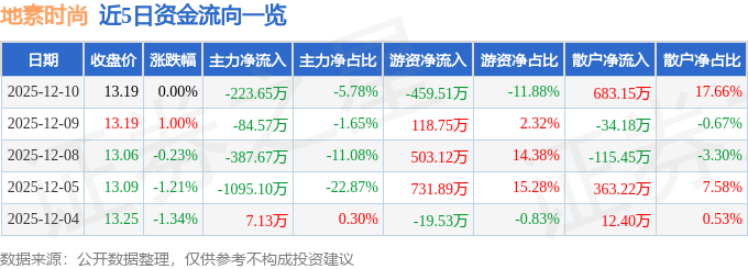 证券之星消息,截至2025年12月10日收盘,地素时尚(603587)报收于13.19元,上涨0.0%,换手率0.62%,成交量2.92万手,成交额3868.14万元。