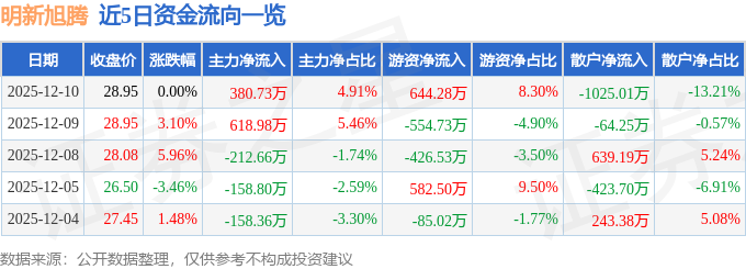 12月10日的资金流向数据方面,主力资金净流入380.73万元,占总成交额4.91%,游资资金净流入644.28万元,占总成交额8.3%,散户资金净流出1025.01万元,占总成交额13.21%。