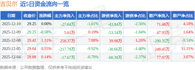 12月10日的资金流向数据方面,主力资金净流出27.64万元,占总成交额1.61%,游资资金净流出43.84万元,占总成交额2.56%,散户资金净流入71.48万元,占总成交额4.18%。