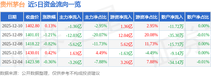 证券之星消息,截至2025年12月10日收盘,贵州茅台(600519)报收于1402.8元,上涨0.13%,换手率0.26%,成交量3.31万手,成交额46.26亿元。