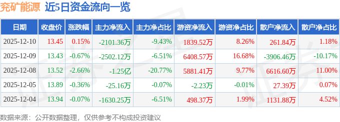 证券之星消息,截至2025年12月10日收盘,兖矿能源(600188)报收于13.45元,上涨0.15%,换手率0.28%,成交量16.56万手,成交额2.23亿元。