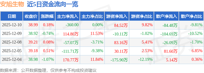 证券之星消息,截至2025年12月10日收盘,安旭生物(688075)报收于38.99元,上涨0.18%,换手率0.17%,成交量2215.0手,成交额860.98万元。