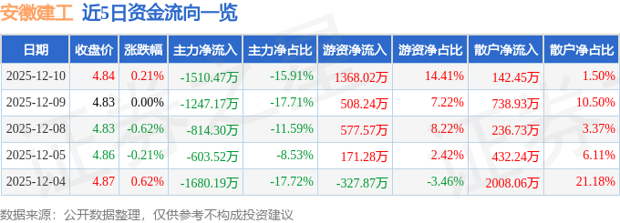 证券之星消息,截至2025年12月10日收盘,安徽建工(600502)报收于4.84元,上涨0.21%,换手率1.15%,成交量19.69万手,成交额9495.58万元。
