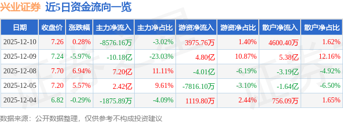 证券之星消息,截至2025年12月10日收盘,兴业证券(601377)报收于7.26元,上涨0.28%,换手率4.53%,成交量391.24万手,成交额28.35亿元。