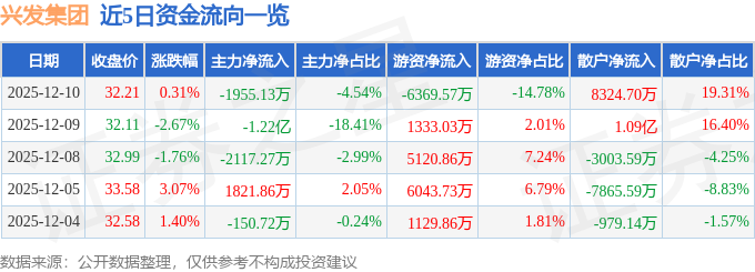 证券之星消息,截至2025年12月10日收盘,兴发集团(600141)报收于32.21元,上涨0.31%,换手率1.21%,成交量13.39万手,成交额4.31亿元。