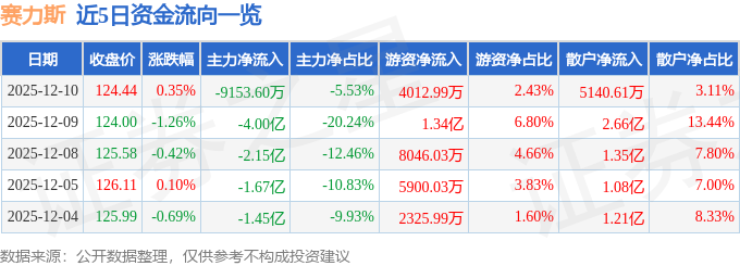 证券之星消息,截至2025年12月10日收盘,赛力斯(601127)报收于124.44元,上涨0.35%,换手率0.89%,成交量13.38万手,成交额16.55亿元。