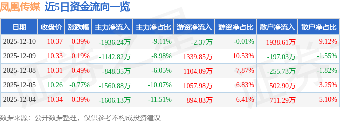 证券之星消息,截至2025年12月10日收盘,凤凰传媒(601928)报收于10.37元,上涨0.39%,换手率0.81%,成交量20.51万手,成交额2.13亿元。