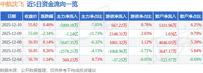 证券之星消息,截至2025年12月10日收盘,中航沈飞(600760)报收于55.82元,上涨0.4%,换手率0.56%,成交量15.41万手,成交额8.53亿元。