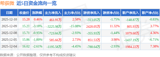 证券之星消息,截至2025年12月10日收盘,希荻微(688173)报收于15.28元,上涨0.46%,换手率2.9%,成交量11.81万手,成交额1.79亿元。