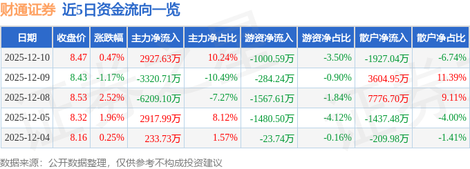 证券之星消息,截至2025年12月10日收盘,财通证券(601108)报收于8.47元,上涨0.47%,换手率0.73%,成交量33.97万手,成交额2.86亿元。