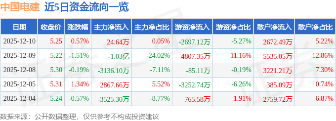 证券之星消息,截至2025年12月10日收盘,中国电建(601669)报收于5.25元,上涨0.57%,换手率0.75%,成交量98.15万手,成交额5.12亿元。