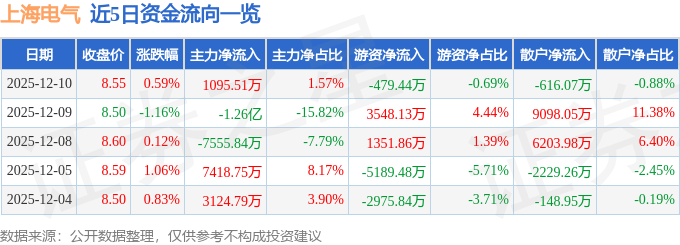 证券之星消息,截至2025年12月10日收盘,上海电气(601727)报收于8.55元,上涨0.59%,换手率0.65%,成交量81.93万手,成交额6.97亿元。