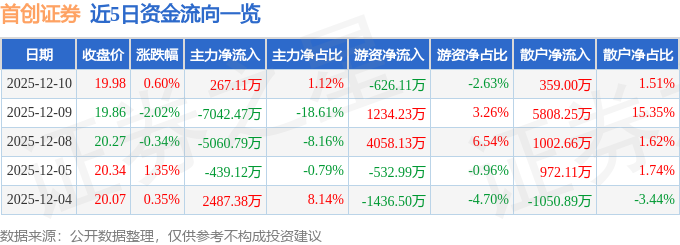 证券之星消息,截至2025年12月10日收盘,首创证券(601136)报收于19.98元,上涨0.6%,换手率2.48%,成交量11.94万手,成交额2.38亿元。