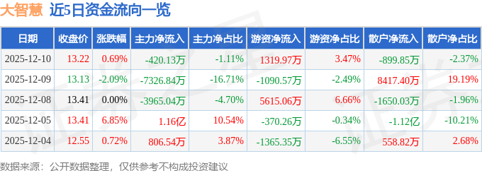 证券之星消息,截至2025年12月10日收盘,大智慧(601519)报收于13.22元,上涨0.69%,换手率1.46%,成交量28.98万手,成交额3.8亿元。