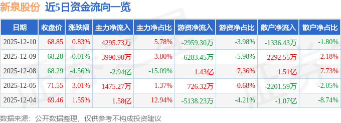 证券之星消息,截至2025年12月10日收盘,新泉股份(603179)报收于68.85元,上涨0.83%,换手率2.13%,成交量10.87万手,成交额7.43亿元。