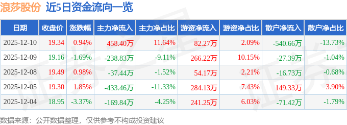 12月10日的资金流向数据方面,主力资金净流入458.4万元,占总成交额11.64%,游资资金净流入82.27万元,占总成交额2.09%,散户资金净流出540.66万元,占总成交额13.73%。