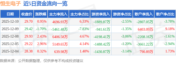 证券之星消息,截至2025年12月10日收盘,恒生电子(600570)报收于29.7元,上涨0.95%,换手率1.33%,成交量25.21万手,成交额7.42亿元。