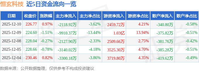 证券之星消息,截至2025年12月10日收盘,恒玄科技(688608)报收于226.77元,上涨0.97%,换手率1.55%,成交量2.61万手,成交额5.85亿元。