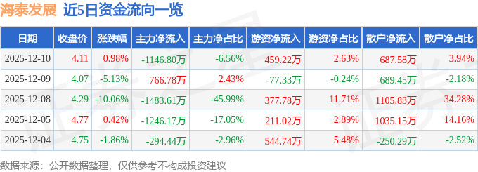 证券之星消息,截至2025年12月10日收盘,海泰发展(600082)报收于4.11元,上涨0.98%,换手率6.72%,成交量42.63万手,成交额1.75亿元。
