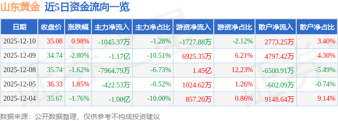证券之星消息,截至2025年12月10日收盘,山东黄金(600547)报收于35.08元,上涨0.98%,换手率0.64%,成交量23.26万手,成交额8.16亿元。