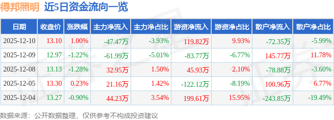 证券之星消息,截至2025年12月10日收盘,得邦照明(603303)报收于13.1元,上涨1.0%,换手率0.19%,成交量9296.0手,成交额1206.93万元。