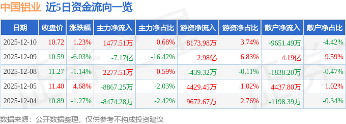 证券之星消息,截至2025年12月10日收盘,中国铝业(601600)报收于10.72元,上涨1.23%,换手率1.56%,成交量205.56万手,成交额21.83亿元。
