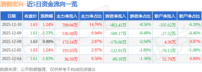 证券之星消息,截至2025年12月10日收盘,酒钢宏兴(600307)报收于1.63元,上涨1.24%,换手率0.53%,成交量33.48万手,成交额5413.18万元。