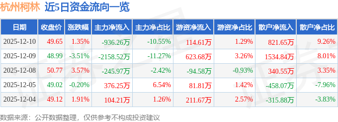 12月10日的资金流向数据方面,主力资金净流出936.26万元,占总成交额10.55%,游资资金净流入114.61万元,占总成交额1.29%,散户资金净流入821.65万元,占总成交额9.26%。