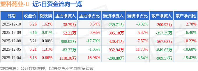 证券之星消息,截至2025年12月10日收盘,盟科药业(688373)报收于6.26元,上涨1.62%,换手率2.2%,成交量11.56万手,成交额7227.87万元。