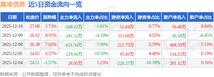 证券之星消息,截至2025年12月10日收盘,高凌信息(688175)报收于27.08元,上涨1.73%,换手率1.93%,成交量2.49万手,成交额6723.35万元。