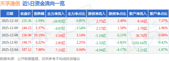 证券之星消息,截至2025年12月10日收盘,天孚通信(300394)报收于235.36元,下跌1.99%,换手率6.1%,成交量47.33万手,成交额110.81亿元。