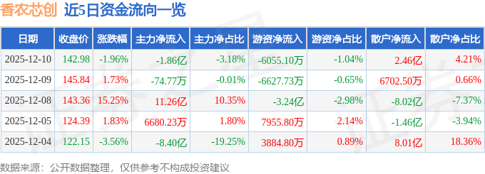 证券之星消息,截至2025年12月10日收盘,香农芯创(300475)报收于142.98元,下跌1.96%,换手率9.34%,成交量41.59万手,成交额58.45亿元。