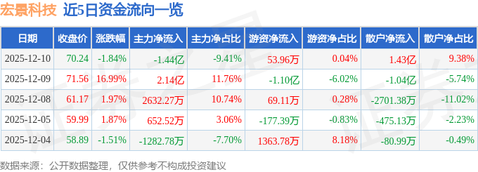 证券之星消息,截至2025年12月10日收盘,宏景科技(301396)报收于70.24元,下跌1.84%,换手率28.19%,成交量21.45万手,成交额15.25亿元。