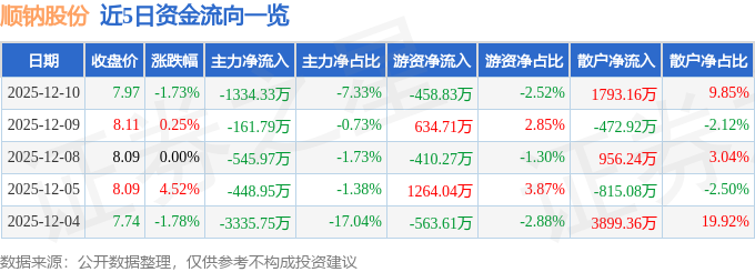 证券之星消息,截至2025年12月10日收盘,顺钠股份(000533)报收于7.97元,下跌1.73%,换手率3.34%,成交量22.87万手,成交额1.82亿元。