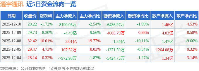 证券之星消息,截至2025年12月10日收盘,通宇通讯(002792)报收于29.22元,下跌1.72%,换手率32.23%,成交量107.45万手,成交额32.28亿元。