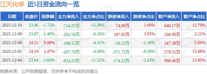 证券之星消息,截至2025年12月10日收盘,江天化学(300927)报收于23.46元,下跌1.72%,换手率1.4%,成交量1.98万手,成交额4643.67万元。