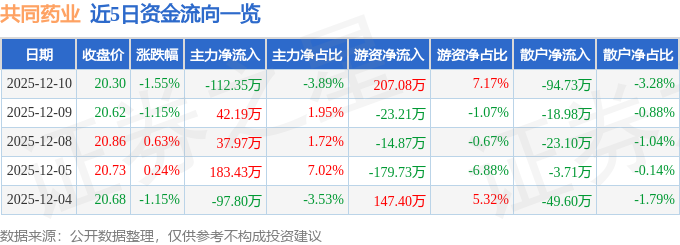 证券之星消息,截至2025年12月10日收盘,共同药业(300966)报收于20.3元,下跌1.55%,换手率1.85%,成交量1.42万手,成交额2888.48万元。