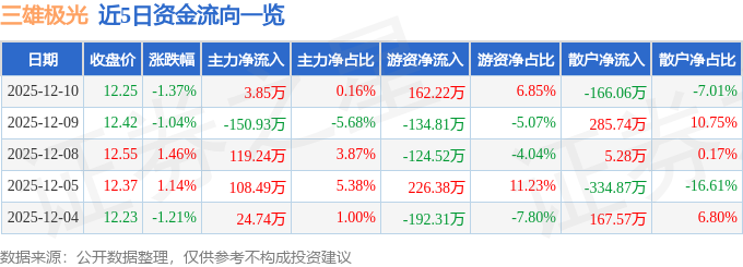 证券之星消息,截至2025年12月10日收盘,三雄极光(300625)报收于12.25元,下跌1.37%,换手率1.19%,成交量1.92万手,成交额2369.07万元。