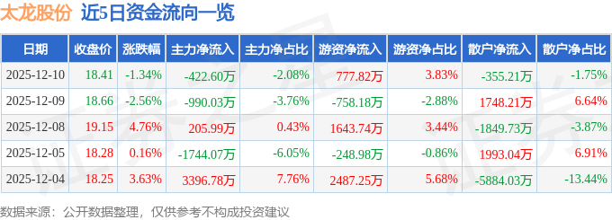 证券之星消息,截至2025年12月10日收盘,太龙股份(300650)报收于18.41元,下跌1.34%,换手率6.45%,成交量10.99万手,成交额2.03亿元。