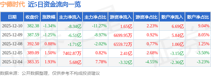 证券之星消息,截至2025年12月10日收盘,宁德时代(300750)报收于382.38元,下跌1.34%,换手率0.46%,成交量19.43万手,成交额73.99亿元。