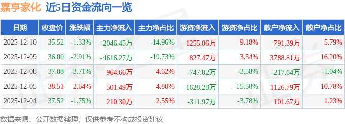 证券之星消息,截至2025年12月10日收盘,嘉亨家化(300955)报收于35.52元,下跌1.33%,换手率3.86%,成交量3.89万手,成交额1.37亿元。