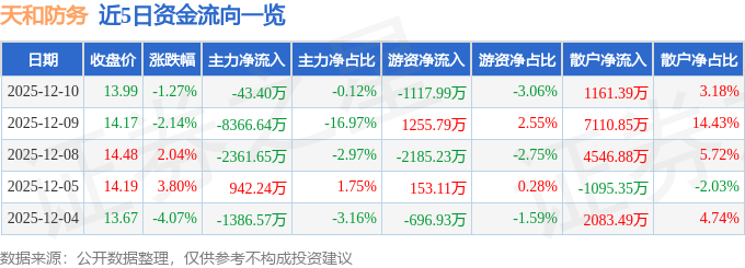 证券之星消息,截至2025年12月10日收盘,天和防务(300397)报收于13.99元,下跌1.27%,换手率6.39%,成交量25.91万手,成交额3.65亿元。