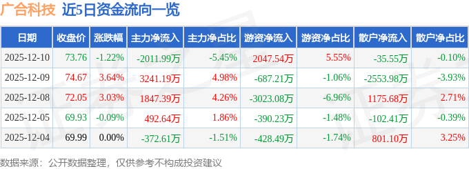 证券之星消息,截至2025年12月10日收盘,广合科技(001389)报收于73.76元,下跌1.22%,换手率3.35%,成交量5.04万手,成交额3.69亿元。