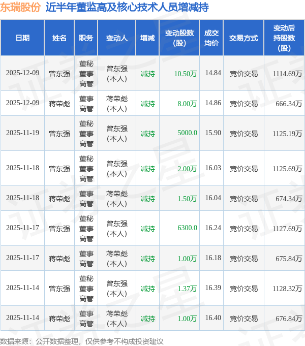 证券之星消息,根据12月10日市场公开信息、上市公司公告及交易所披露数据整理,东瑞股份(001201)最新董监高及相关人员股份变动情况:2025年12月9日公司董秘,董事,高管曾东强、董事,高管蒋荣彪共减持公司股份18.5万股,占公司总股本为0.0717%。变动期间公司股价下跌1.47%,12月9日当日收盘报14.73元。