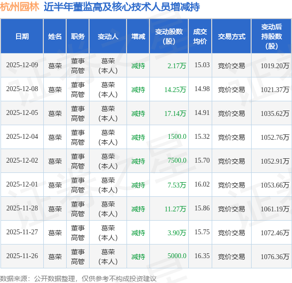杭州园林近半年内的董监高及核心技术人员增减持详情如下: