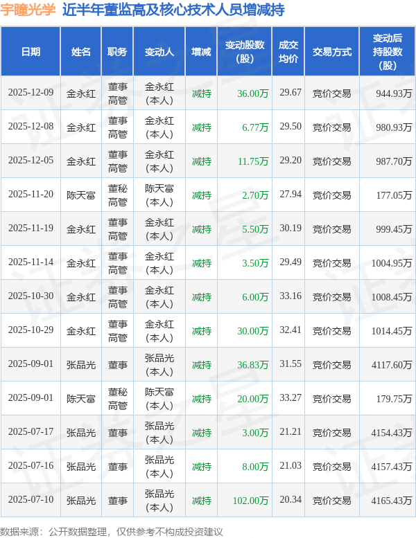 宇瞳光学近半年内的董监高及核心技术人员增减持详情如下: