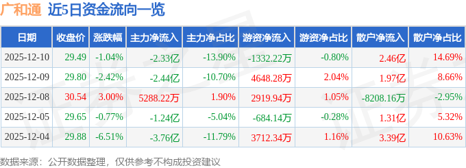 12月10日的资金流向数据方面,主力资金净流出2.33亿元,占总成交额13.9%,游资资金净流出1332.22万元,占总成交额0.8%,散户资金净流入2.46亿元,占总成交额14.69%。