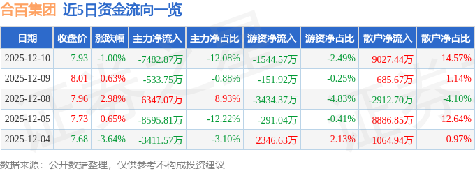 证券之星消息,截至2025年12月10日收盘,合百集团(000417)报收于7.93元,下跌1.0%,换手率9.94%,成交量77.42万手,成交额6.2亿元。
