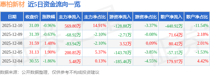 证券之星消息,截至2025年12月10日收盘,惠柏新材(301555)报收于31.09元,下跌0.96%,换手率2.53%,成交量1.22万手,成交额3821.26万元。